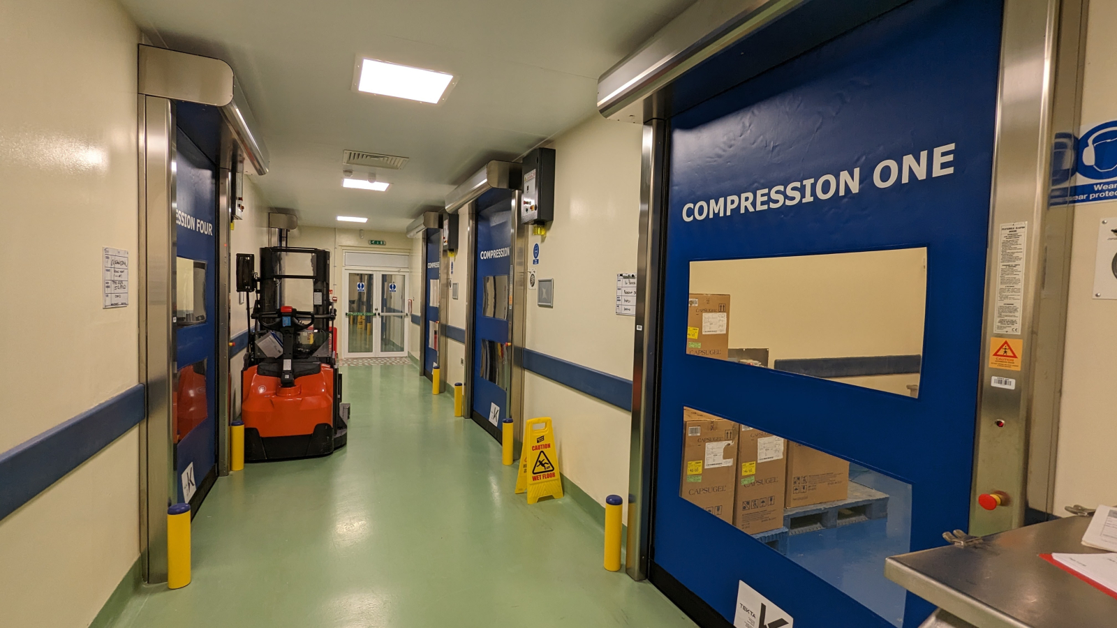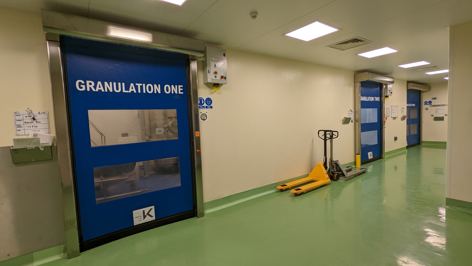 Tekta installed 22 Rapidor Pharma, speed doors on site. The key benefits include, air-permeability of <12m3/m2h at 50Pa, high speed operation of up to 2000mm/second, anti-static curtain and grade 304 or 316 stainless steel frame. Due to the door types high performance, the customer reported turning down their air handles. “They no longer need to be running at full power to get the same amount of air differential in the room. It’s made us more efficient.
